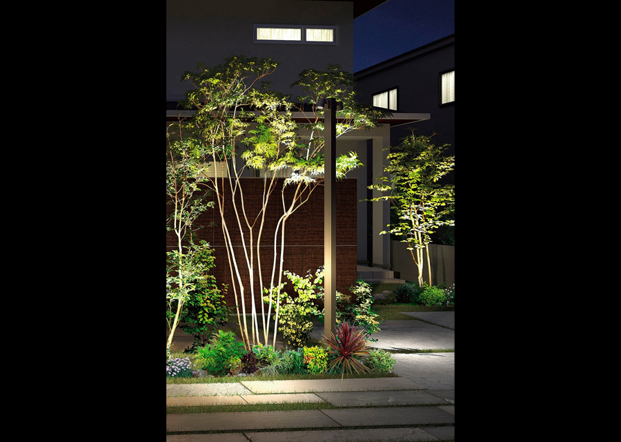 正面にある樹木や壁を照らすことで奥行き感を演出。